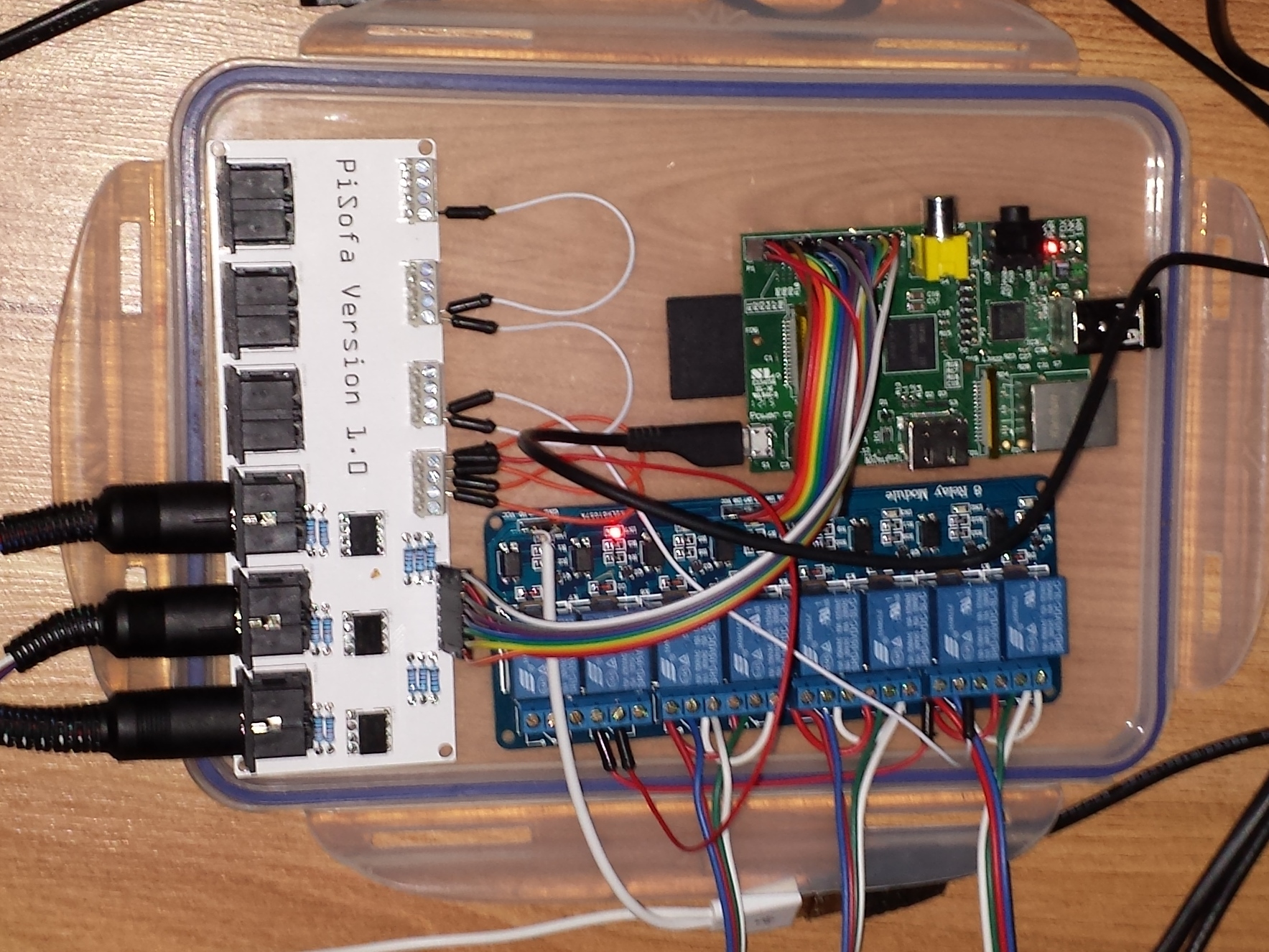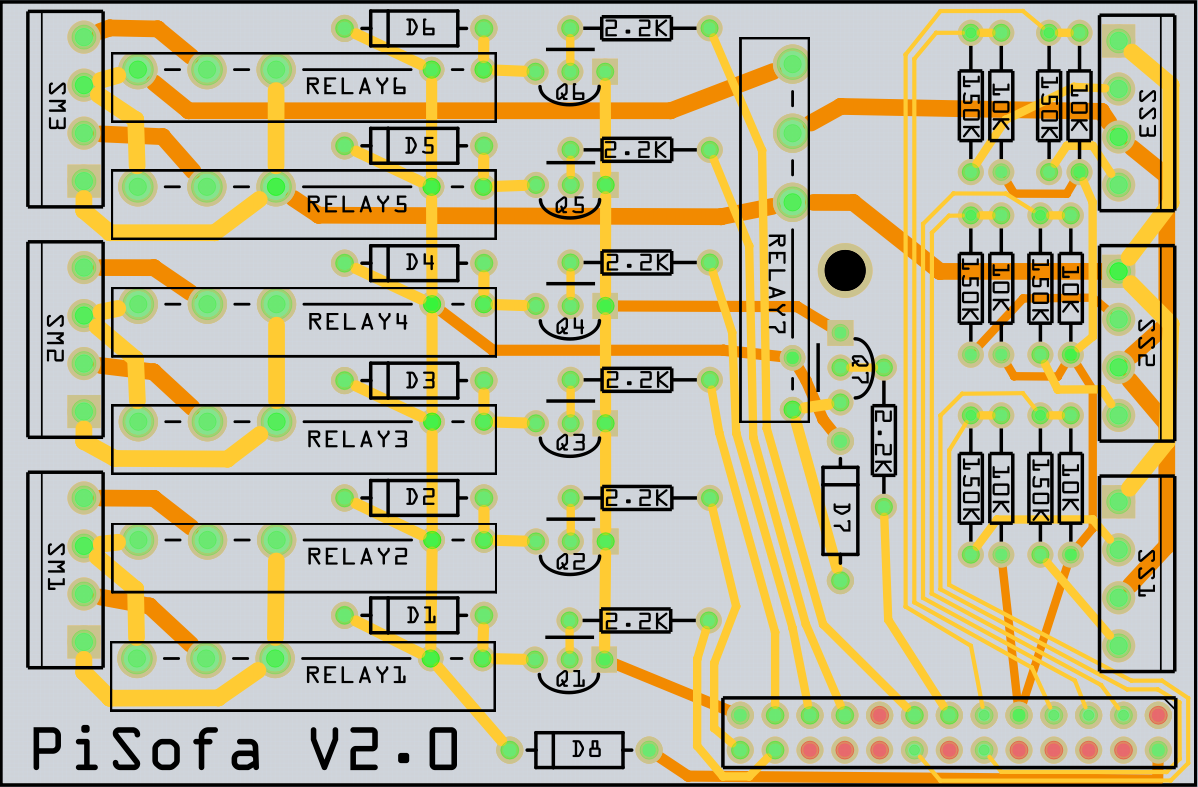 - Replacing the large overpowered relay board with lower powered 5mm relays. These run at just 34 mAmps each (238 for all 7). This means the PiSofa board could be powered directly from the Pi