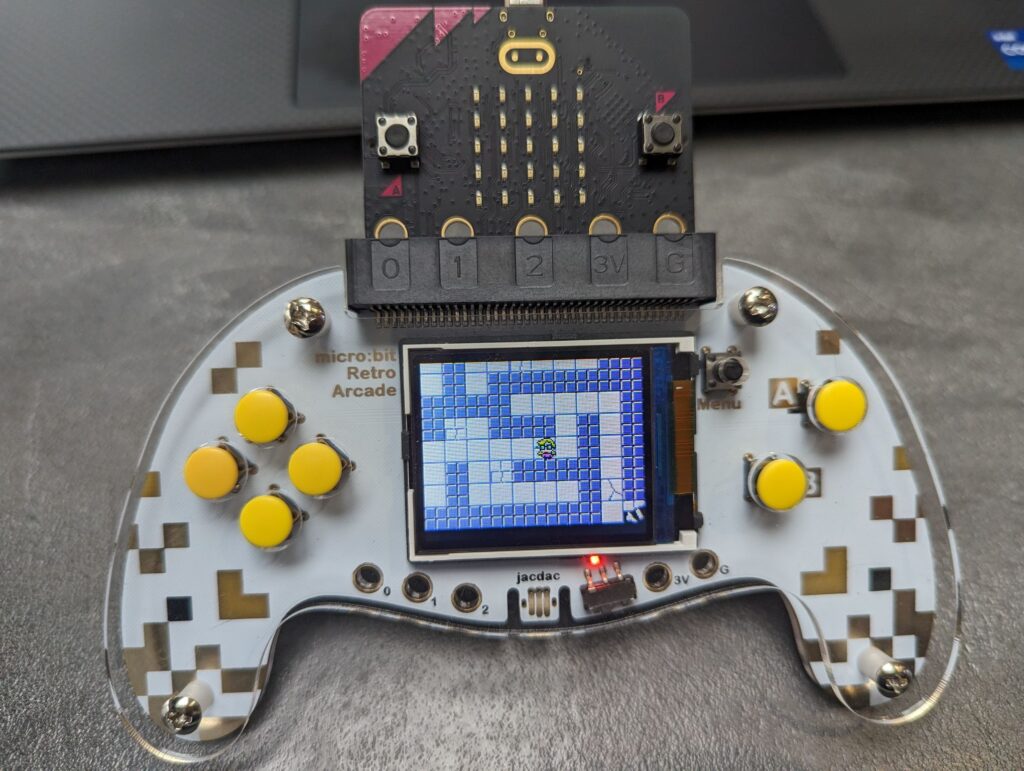 One thing I love about MakeCode arcade is that the games can actually be downloaded and played on a range of handheld gaming devices which the children love doing! I particularly like using Elecfreaks Retro Arcade as the game saves to a micro:bit which then plugs into the handheld device, effectively becoming the game cartridge, this makes it a lot easier for children to share devices and also provides opportunities for designing packaging for the games.