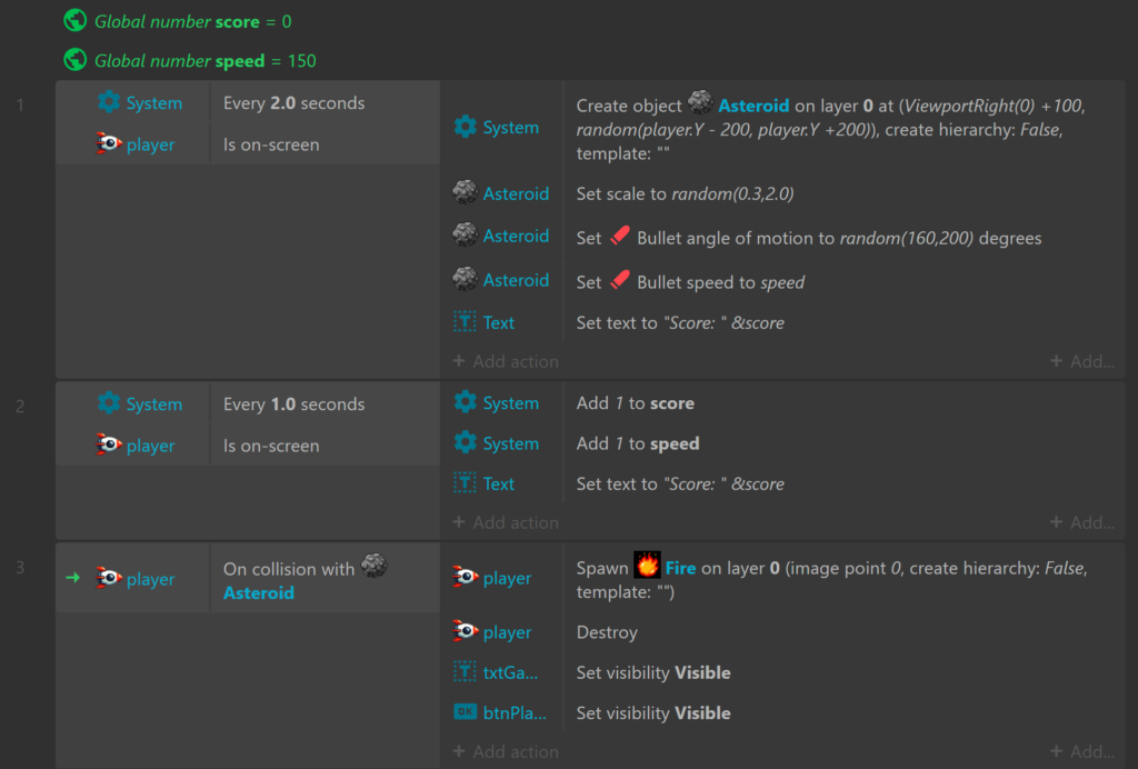 The programming aspect is basically the same as Construct 3, add behaviours to objects then using the event sheet to set conditions and actions. Again, you can also add JavaScript programming. Unlike Construct 3, the free version has no limits on the number of events you can use and also appears to have no limit on the number of layers either.