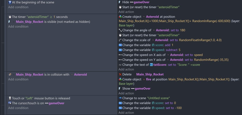 As this is a professional-level game engine, it is a lot more complicated for beginners, and students would ideally need an understanding of object oriented programming to get started developing their own games in Godot. If you have students in KS4 and KS5 who want to take their coding skills to the next level and potentially go into game development in the future they should definitely check out Godot. If they have used the platforms mentioned earlier they will be familiar with the interface somewhat in that it follows the same approach of having objects which are added to the scene with properties that can be tweaked. The key difference is with the programming; instead of a general event sheet with conditions and actions, these need to be coded individually per object (node), typically by adding a script to each object to apply actions. From what I have seen in the past, this is generally how advanced game engines work, Roblox Studio, for example is similar. Godot has its own scripting language, GDScript, which is similar to Python. If you’re looking to get started with Godot check out their documentation which takes you step-by-step through making your first games. I haven’t had chance to work through the tutorial myself so haven’t managed to create a Godot version of my space game yet!