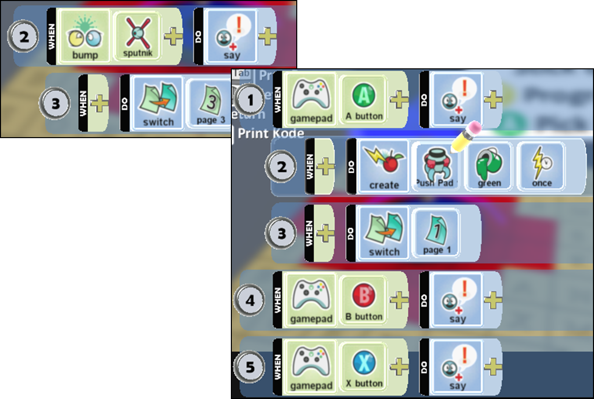 First the Stick asks a question then goes to Page 3. On this page it responds to the answer pressed on the gamepad. In this example the correct answer is given with the A button, in which the player is awarded with a pushpad (key) for the next part of the game. If the player gives a different answer the Stick will respond telling them they have the answer wrong and to try again. In my game I allow the player to have as many guesses as they like but this could be changed to make the game more difficult.