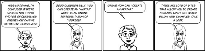 This was the most entertaining avatar maker I found. The actual purpose of the site is to allow you to create comic strips with the characters you create (like the one at the top of the post). Once you create a character you can save multiple versions of it with different moods ready to use in your comic strips. The actual character creation mode is also probably one of the most detailed I’ve seen. It contains a variety of packs developed by other users containing objects, facial features, hairstyles etc. meaning you can create quite an accurate avatar. The only downside to this is that the pictures are in black and white. I intend to use this tool when I am creating guide sheets for my students. I think it will be a bit more entertaining for them to read if they see a little cartoon version of myself talking to them!