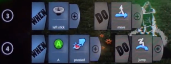 My third exciting thing is a bit further down the line and is called Project Spark. I heard about this when it was launched at E3 last week, check out the video here. This looks like a fantastic progression route from Kodu. Again, it allows you to build your own games in a similar style and the programming instructions are given in the same event-driven way as Kodu as shown below. This will make the jump between the two game environments even smaller: